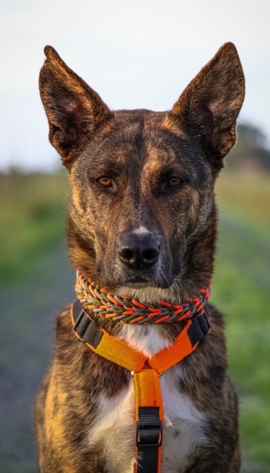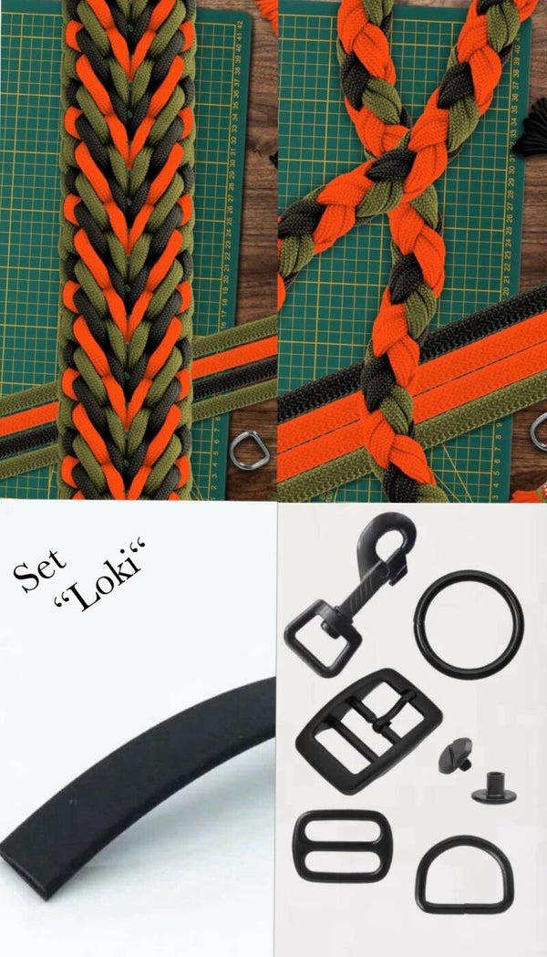Loki's Set besteht aus dem Muster Marshmallow, in den Farben Schwarz, Army Green und Neon Orange. Das Halsband hat eine Breite von ca. 4,5cm. Passend dazu gibt es eine 200cm Leine in dem Round Double Muster.